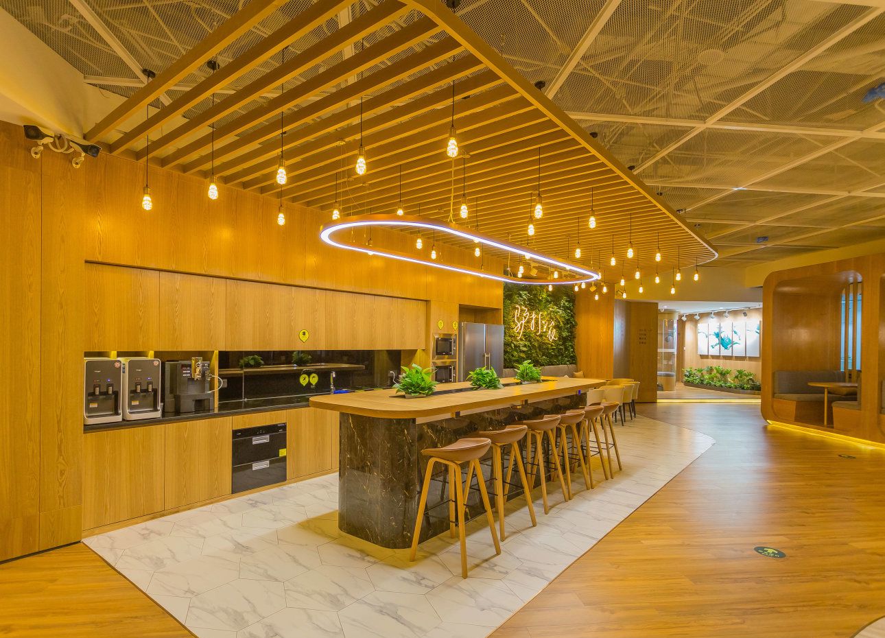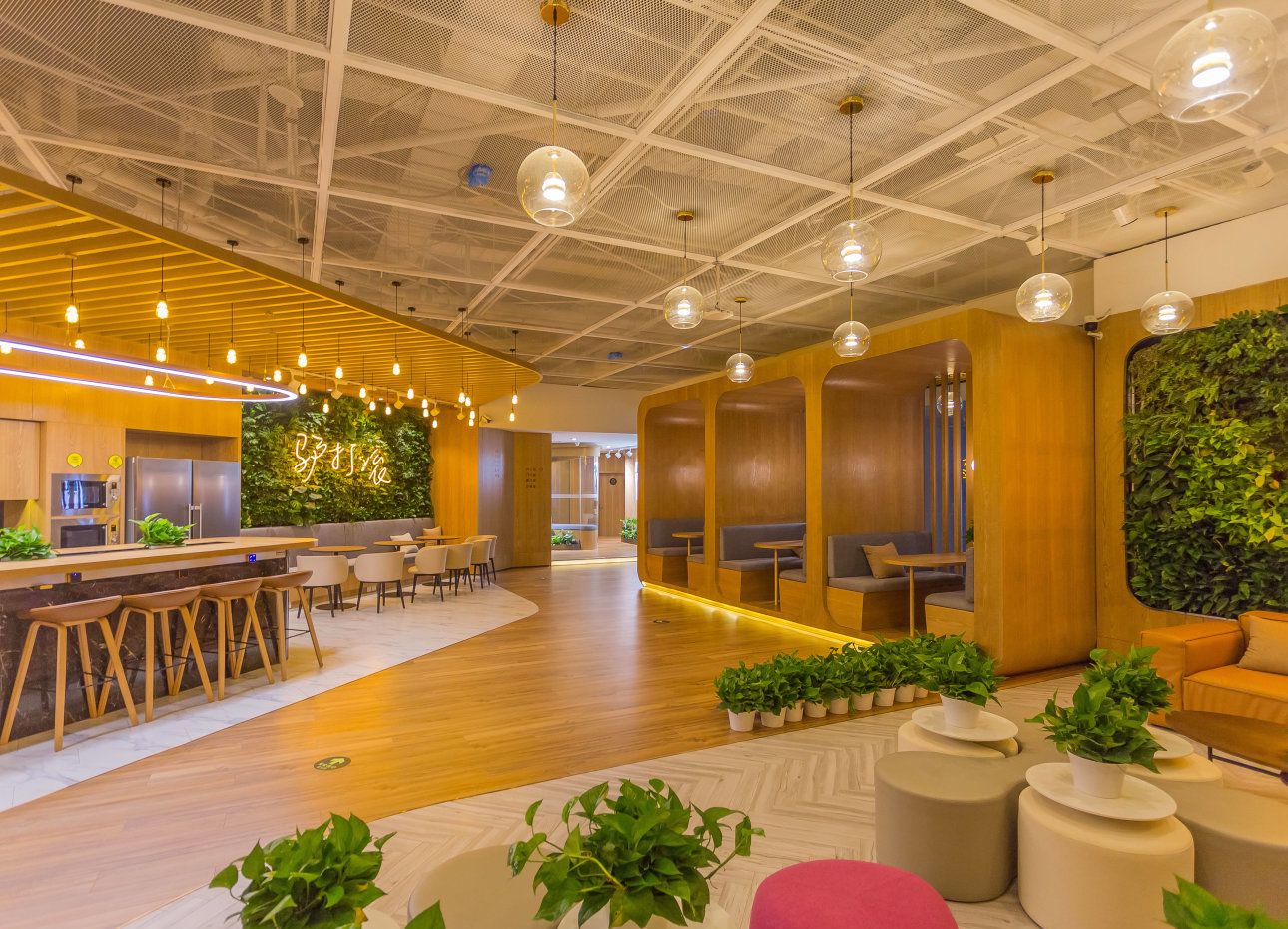 FUNWORK始终从用户的真实需求出发,不断雕琢产品的设计和运营服务。以“简约、极致”为核心,以健康的环境、活力的社群、智能的办公为特色,让办公回归本源。北京FUNWORK北京国际会议中心 空间地处亚运村,紧邻鸟巢和水立方等地标性建筑;周围交通便利、酒店商业配套设施齐全;空间采用挑高式结构,开扬明亮,一扫传统办公室的压抑,清新的大面积绿植打造出令人沉醉的一片绿海,再搭配活泼明亮的柠檬黄与湖水蓝点缀,尽显共享空间的活力与趣味。