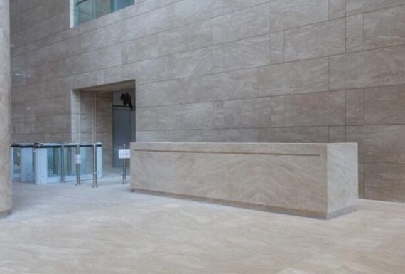 色调上以米黄石材搭配白色石材