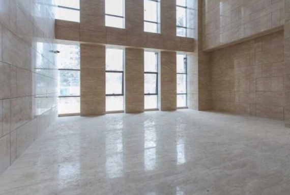 色调上延伸大堂做法,墙面米黄石材与南侧条窗搭配
