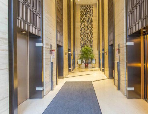 大堂及公共部分:10.5米阔然挑高,设计手法简约现代,墙面为米黄洞石,地面为卡拉米黄天然洞石,为同品类中的最高品级,尽展精英者摄人风范。