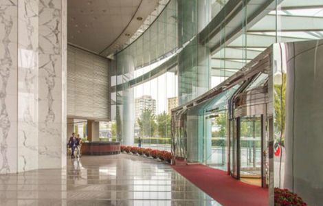 大堂及公共部分:地面及内置墙面:进口磨光花岗岩 雨搭、大门、外墙身:钢化浮法玻璃。 天花:铝合金薄板天花。